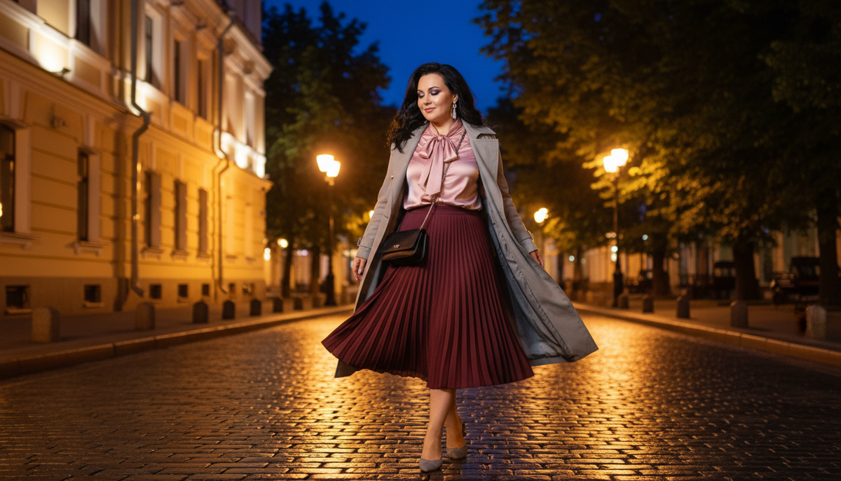 Бургунди и ледяной розовый - на первый взгляд, неожиданная пара. Но именно в этом магия Холодной Зимы: холодные оттенки из разных концов спектра находят друг друга и звучат как два голоса в дуэте. Тёмная плиссированная юбка утяжеляет низ ровно настолько, чтобы создать устойчивость и красивое движение при ходьбе. Складки деликатно обходят линию бёдер, и силуэт выглядит воздушным. Светлая блуза наверху притягивает взгляд к лицу, к мягкому банту у горла, к сиянию кожи в холодном розовом свете.
