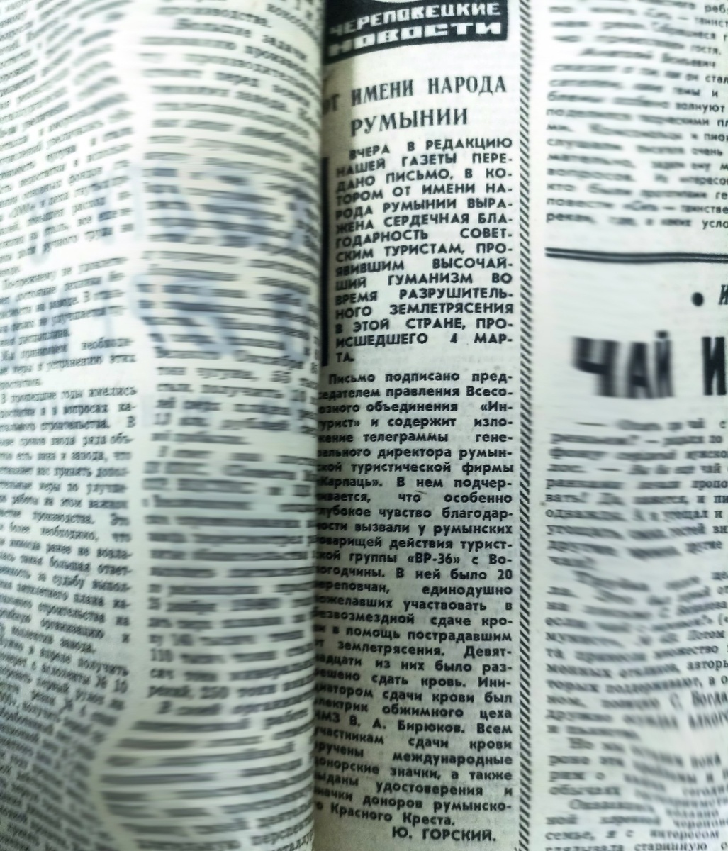 25 марта 1977 года в редакцию газеты «Коммунист» пришло письмо, в котором от имени народа Румынии выражается сердечная благодарность советским туристам, проявившим высочайший гуманизм во время разрушительного землетрясения в этой стране, происшедшего 4 марта. В туристской группе «ВР-36» с Вологодчины было 20 череповчан, единодушно пожелавших участвовать в безвозмездной сдаче крови в помощь пострадавшим от землетрясения. Девятнадцати из них было разрешено стать донорами. Инициатором сдачи крови был электрик обжимного цеха ЧМЗ В.А. Бирюков. Всем участникам сдачи крови были вручены международные донорские значки, а также выданы удостоверения доноров румынского Красного Креста. Речь ВКонтакте | Речь в МАКС | Речь в ОК | Речь в Дзене | 35MEDIA в МАКС