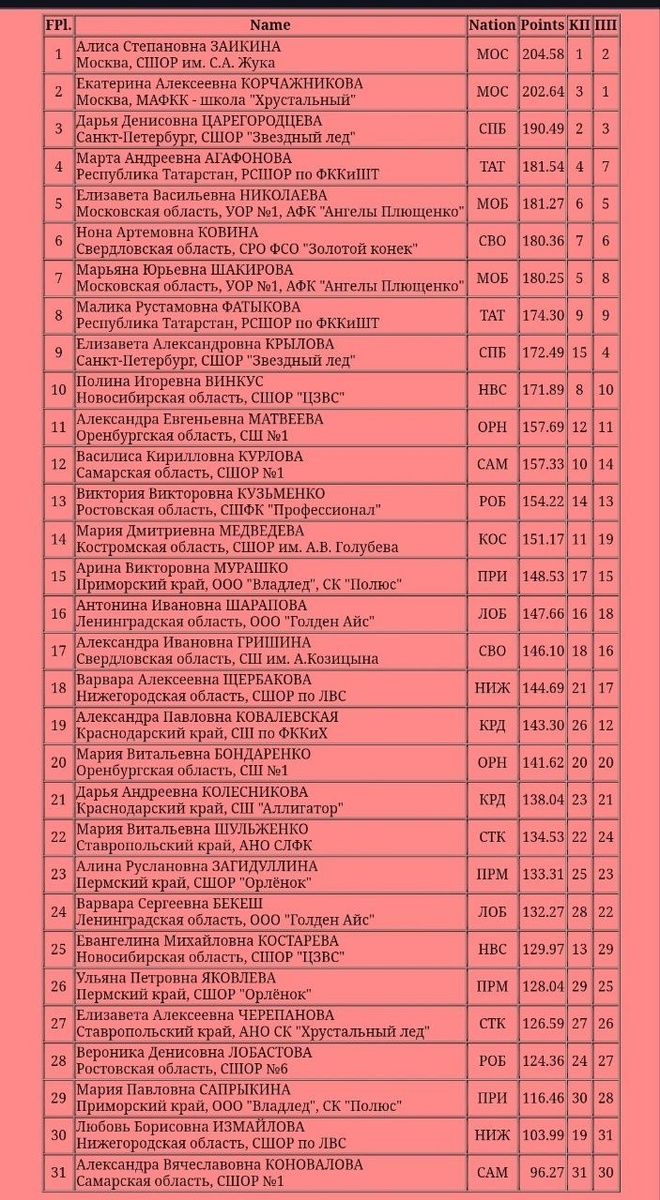 ⚡️Результаты девушек на XIII Зимней Спартакиаде учащихся (юношеская) России 2026 Можно поздравить 🥇Алису Заикину, 🥈Екатерину Корчажникову и 🥉Дарью Царегородцеву с успешным отбором в юношескую сборную РФ.👏 Катю еще и с досрочным выходом в юниоры в следующем сезоне👌Теперь можно без лишнего волнения ехать на ПР (ст.вз.). Там для нее ничего не решается. Алиса и Дарья выходят по возрасту. В целом итоги ровно такие, как и писала выше: 1-2 место москвички, в топ-10 представители Санкт-Петербурга, Татарстана, МО и Винкус. Единственная, кто ворвалась сквозь них в топ-6 - это Нона Ковина. Все они выступили достаточно ровно, в меру своих сил. Даже Крыловой, сорвавшей каскад в КП и Винкус с бабочкой на 3А корить себя не в чем. Царегородцева не оставила никому шансов на бронзу. Алиса Заикина уже в 3-й раз в этом сезоне сделала чисто 3 квада в ПП и триксель в КП. Причем, она не растерялась после бабочки на 4С, а пошла и переделала его. Кажется, стабилизировали ультра-си ей. Это грозная сила