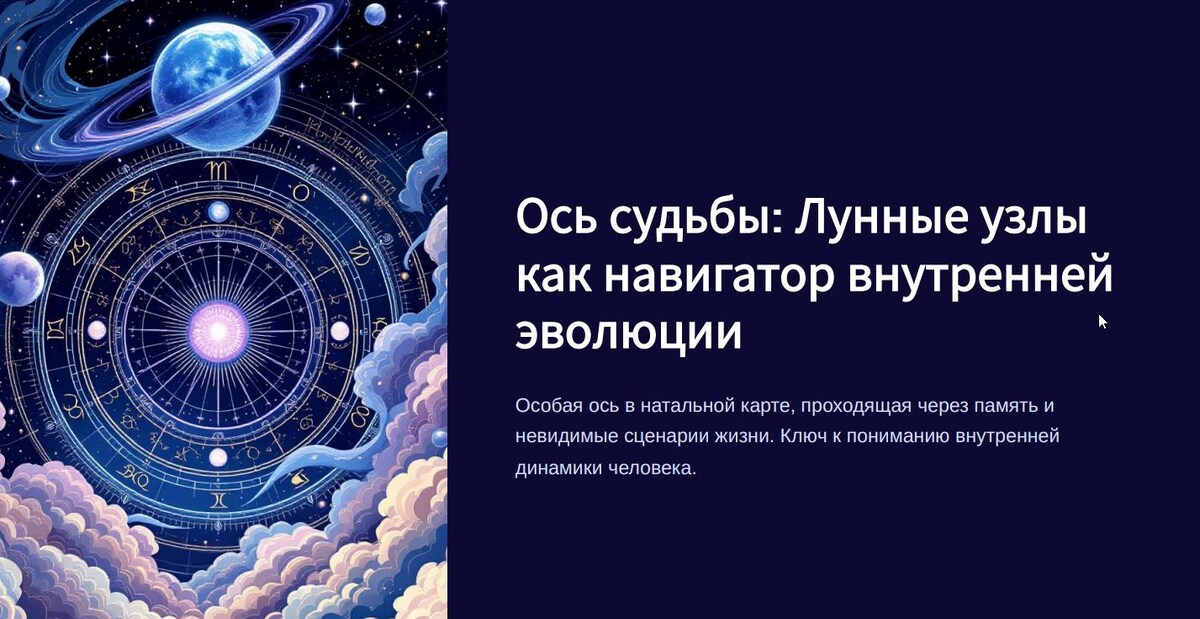 Есть в натальной карте особая ось, о которой говорят значительно реже, чем о Солнце или асценденте, и, возможно, именно поэтому её значение часто недооценивается. Между тем именно она становится тем самым скрытым каркасом, на котором держится внутренняя динамика личности. Речь идёт об оси Лунных узлов — тонкой, почти невидимой линии, проходящей через память, через эмоциональный опыт и через те сценарии, которые человек, сам того не замечая, воспроизводит снова и снова.