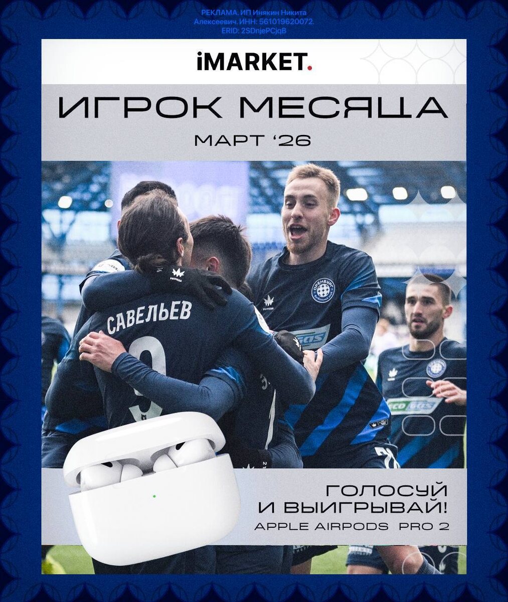 ⚽️ Выбери лучшего игрока марта и получи возможность вручить приз победителю на поле «Газовика»! Но и тебя не оставим без подарка: наш партнер — iMarket подарит тебе новенькие AirPods! → Переходи по ссылке: clck.ru/3Sk49Z → Голосуй за лучшего игрока Голосование продлится до 28 марта. Обладателя AirPods определит рандомайзер. #ФКОренбург