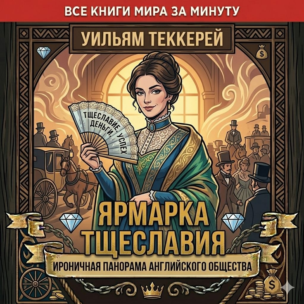 В С Е К Н И Г И М И Р А З А М И Н У Т У Уильям Теккерей — «Ярмарка тщеславия» Суть в одной фразе: Ироничная и едкая панорама английского общества начала XIX века, где каждый стремится к чинам, деньгам и славе, забывая о подлинных чувствах. Мир и герои: Лондон времен наполеоновских войн. В центре сюжета — две подруги-антиподы. Эмилия Седли — добрая, но наивная и бесхребетная девушка из богатой семьи. Бекки Шарп — умная, циничная и чертовски обаятельная сирота без гроша в кармане, готовая на всё, чтобы пробиться в высший свет. Сюжетный драйв: Восхождение Бекки: Пока Эмилия страдает от любви к пустому щеголю, Бекки виртуозно манипулирует мужчинами. Она выходит замуж за сына богатого баронета, проникает в самые закрытые салоны Лондона и становится фавориткой лордов. Война и крах: Битва при Ватерлоо меняет судьбы всех героев. Для кого-то это гибель, а для Бекки — очередной шанс обчистить карманы тех, кто в панике бежит из Брюсселя. Ярмарка в действии: Теккерей показывает, что в