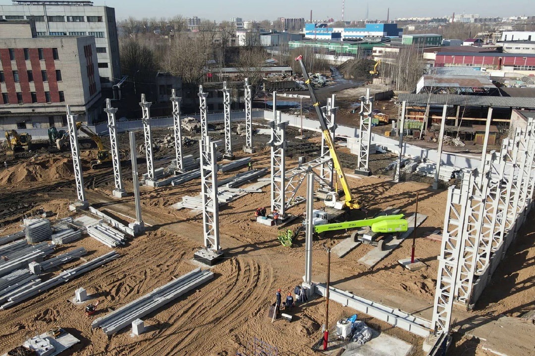 Сегодня на площадке завершен самый трудоемкий этап нулевого цикла – погружены все 549 свай. В фундамент будущего здания забетонировано более половины железобетонных конструкций ростверков. На них установлены металлические колонны высотой 12 м, ведется монтаж межколонных связей, которые соединят каркас в единое целое.
