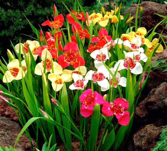 Палитра Тигридии поражает своим разнообразием. Вы можете встретить сорта с лепестками самых разных цветов: