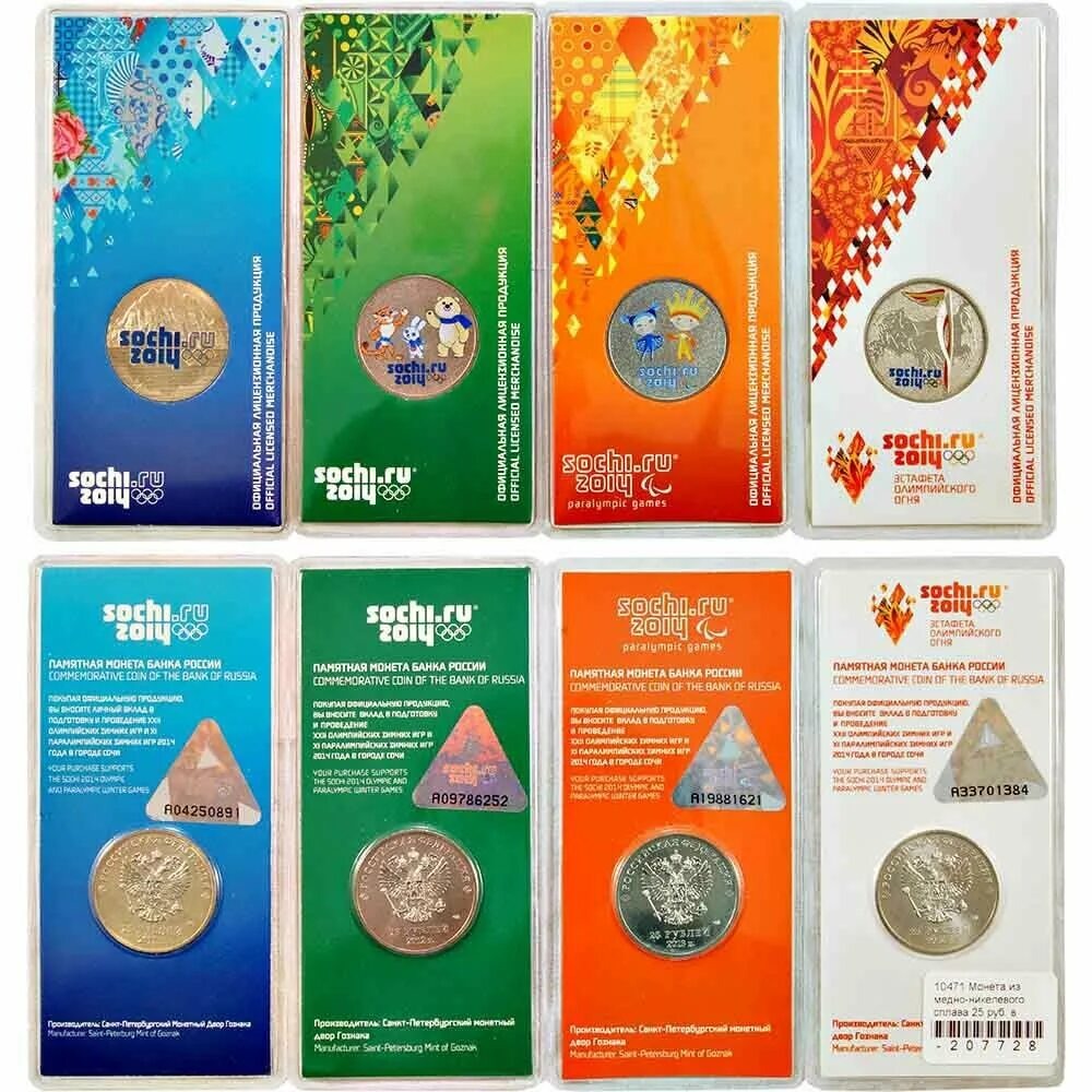 Серия памятных монет «Олимпийские игры в Сочи 2014» была запущена Банком России совместно со Сбербанком и Оргкомитетом игр в период с 2011 по 2014 годы . Цветные монеты номиналом 25 рублей стали особенно популярными среди коллекционеров благодаря своей уникальной технологии нанесения цветного покрытия на реверс.