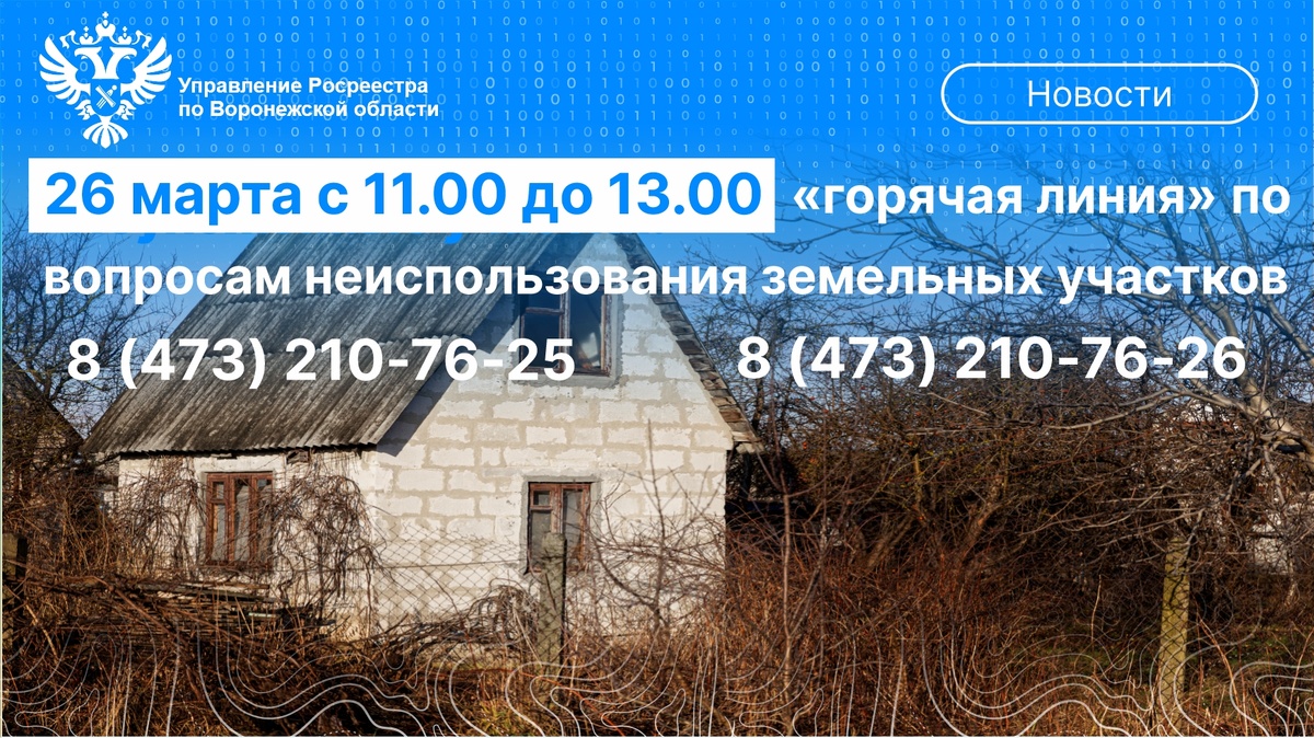 26 марта с 11:00 до 13:00 Управление Росреестра по Воронежской области проведёт консультацию граждан по телефону в формате «горячей линии» по вопросам о порядке применения критериев неиспользования земли. Например, вы сможете узнать, о каких именно признаках идёт речь, как собственникам привести участок в надлежащее состояние, что делать, если земля простаивает из-за объективных причин и т.д. Номера телефонов для связи: – 8 (473) 210-76-25;