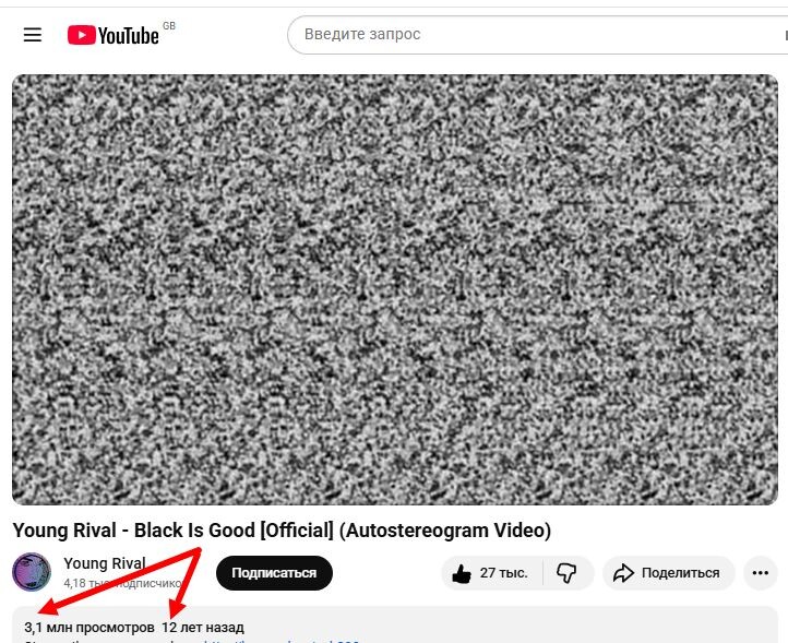 12 лет назад на YouTube опубликовано одно уникальное короткое видео под названием «Young Rival - Black Is Good [Official] (Autostereogram Video)». Это движущаяся стереокартинка. Внутри стереограммы музыкальный клип рок группы Young Rival Его посмотрело более 3-х миллионов зрителей