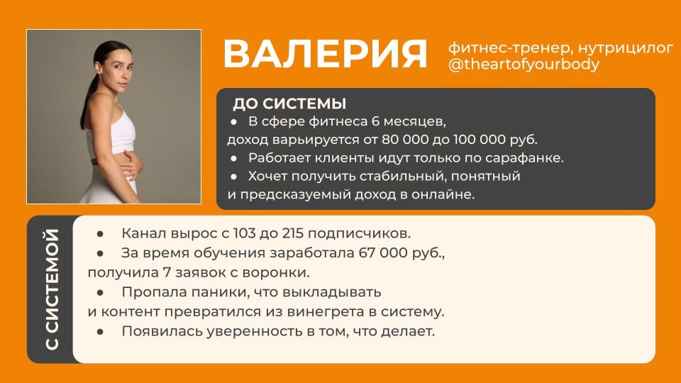 В СИСТЕМУ пришла Валерия Дугарова - фитнес-тренер и нутрициолог Валерия помогает девушкам и мамам: 🟠 худеть без стресса и голодовок 🟠 восстанавливать тело после родов 🟠 выстраивать питание и тренировки А также работает онлайн с клиентками по питанию и тренировкам и оффлайн инструктором по направлению Jumping Fitness 🟧В фитнес-сфере Валерия всего 6 месяцев, а онлайн работает 3 месяца, при этом еще находится в декретном отпуске Доход на момент прихода в СИСТЕМУ выглядел так: — оффлайн: 70–80 тыс. руб. — онлайн: 5–20 тыс. руб. Основной поток клиентов через сарафан и знакомые из студии, при этом Валерия уже понимала важную вещь: «Работая только оффлайн, рано или поздно упрёшься в потолок. У фитнес-тренеров он примерно 200–300 тысяч в месяц, и то в Москве» А ей хотелось вернуть свой доход до декрета, но при этом работать из дома и ее Телеграм-канал на момент прихода в СИСТЕМУ имел 103 подписчика, а также: 🟠 не приносит заявок 🟠 нет системы контента 🟠 непонятно, как продавать