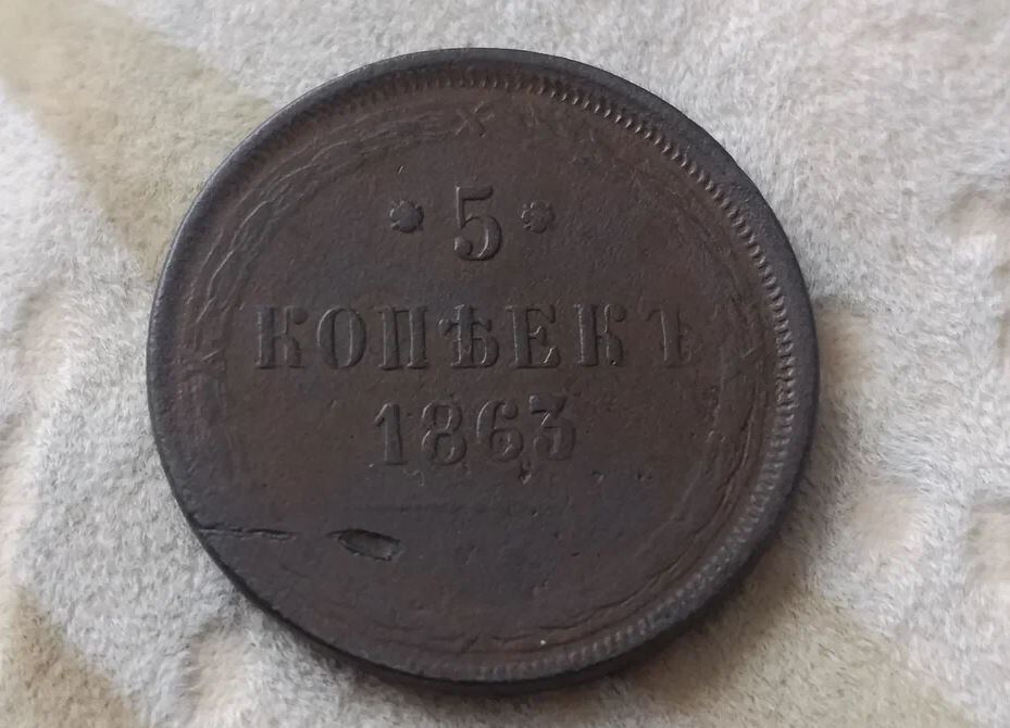 - Лишь бы не было сквозного отверстия, - говорят нумизматы про монеты. Так уж повелось, что сквозное отверстие, которое проходит через монету, лишает её статуса "коллекционной монеты". Уж лучше она будет затертая или иметь незначительные механические повреждения, нежели через неё можно прищурившись смотреть. Но и механические повреждения бывают разные. Одни - особо и не портят внешний вид монеты, а другие - значительно снижают её стоимость. В одной из прошлых публикаций я показал монету в 50 копеек времен Империи, которая имеет хоть и незначительную, но очень заметную царапину, из-за чего её стоимость приближена к стоимости лома серебра. Свою роль играет и факт того, что монета очень массовая. А в этой публикации хотелось бы показать монету, где небольшое "механическое повреждение" и "лёгкая затёртость" не так сильно бросаются в глаза, а потому монету с чистой совестью можно положить в альбом "до лучших времен". Вот такая у меня в альбоме монета 5 копеек 1863 года: Видно, что моне