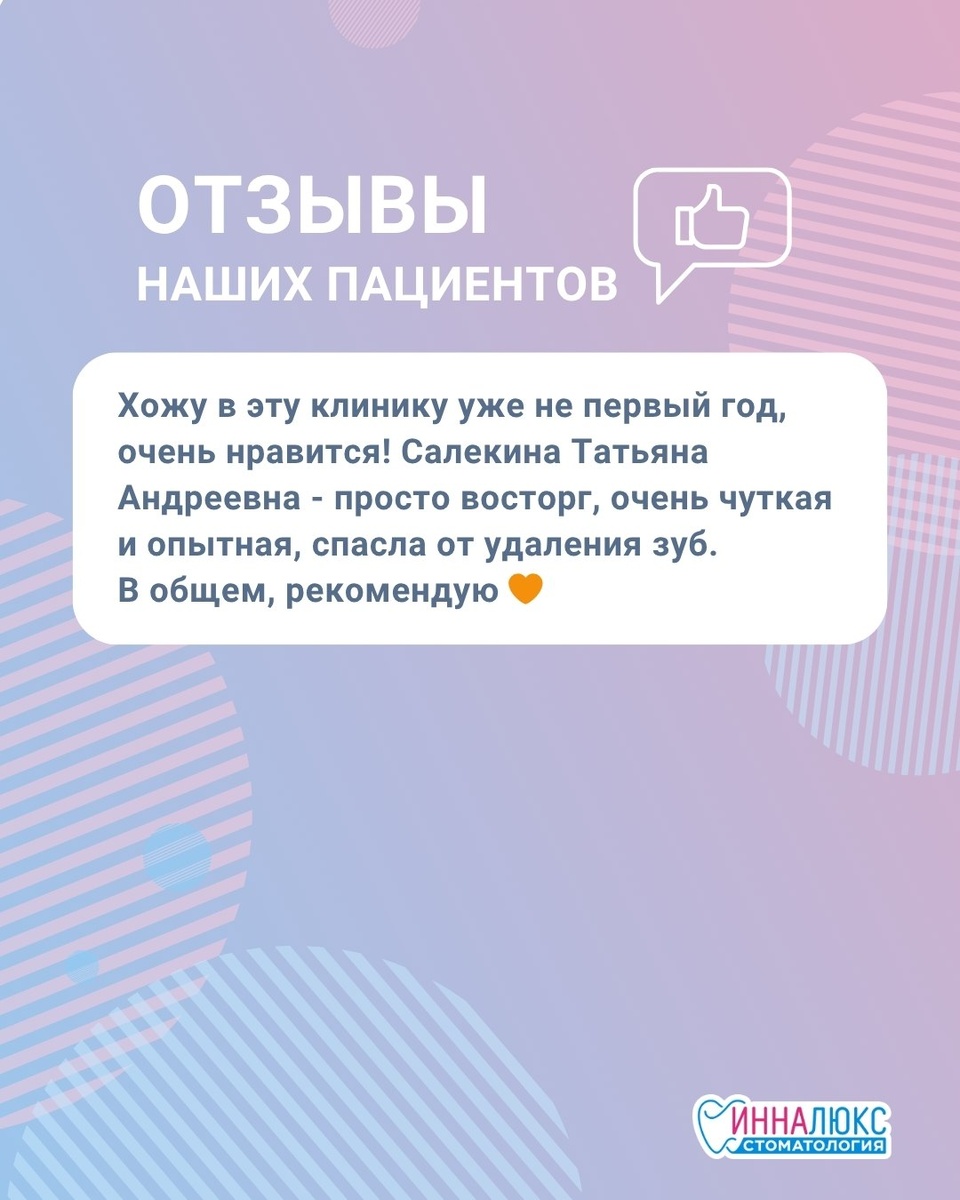 😊 Татьяна Андреевна — именно тот врач, который всегда старается сохранить зуб, если есть хоть малейшая возможность. Обязательно передадим ей ваши слова благодарности. Кстати, она принимает не только взрослых, но и детей с 12 лет — так что можете смело приходить всей семьёй в нашу стоматологию. До встречи в клинике!