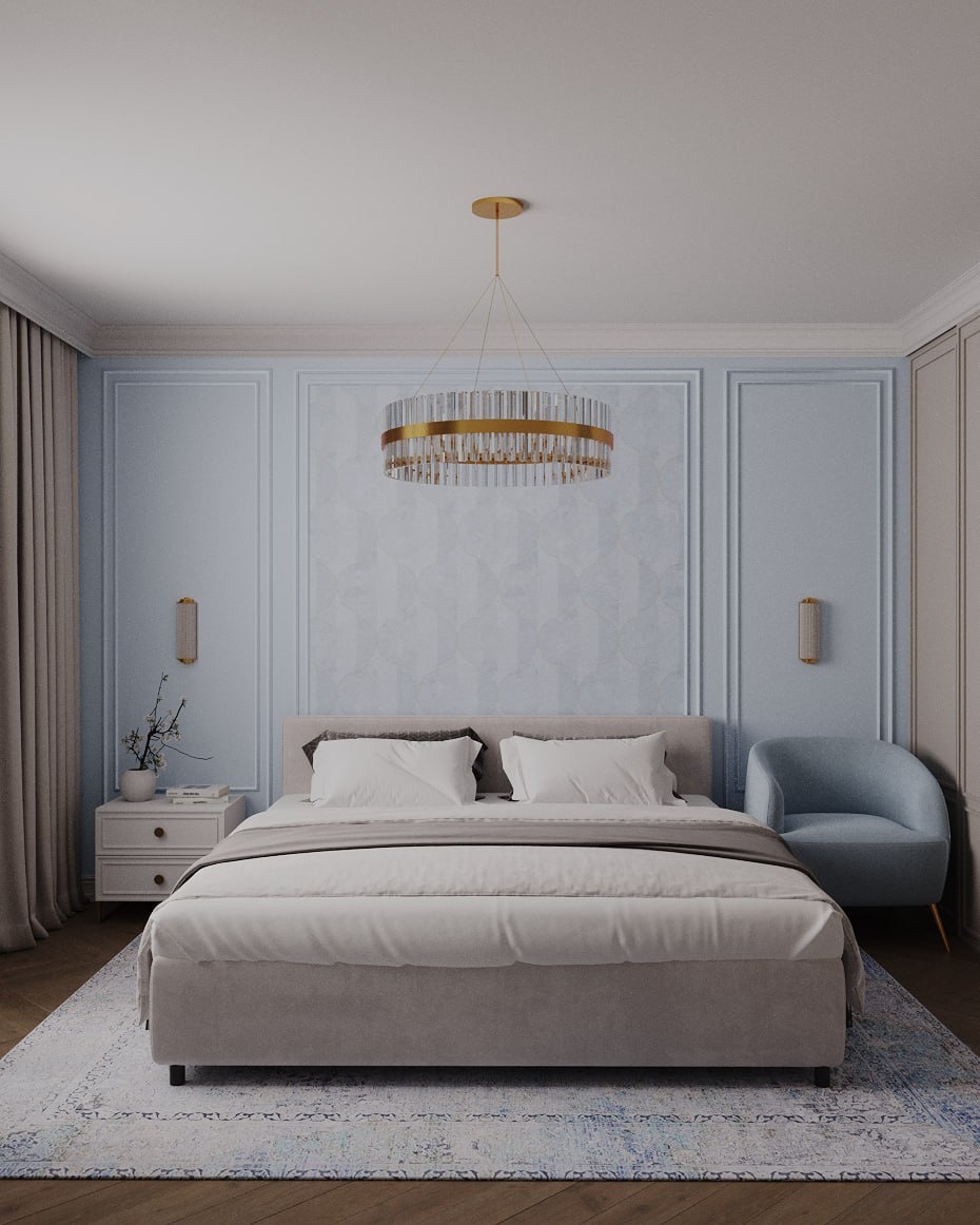 . Мы продолжаем выдерживать стиль американской классики: спокойная палитра, симметрия и ощущение мягкого, обволакивающего комфорта — именно то, что нужно для отдыха. Интерьер получился очень спокойным и уравновешенным, без лишней помпезности, зато с ощущением настоящего уюта.🤎 Стена за кроватью собрана из нескольких приёмов: оформили рамки из молдингов и вписали в них выразительные обои — такой дуэт даёт рельеф, глубину и декоративность без визуального шума. ДЗЕН VK MAX #КатяРаботает