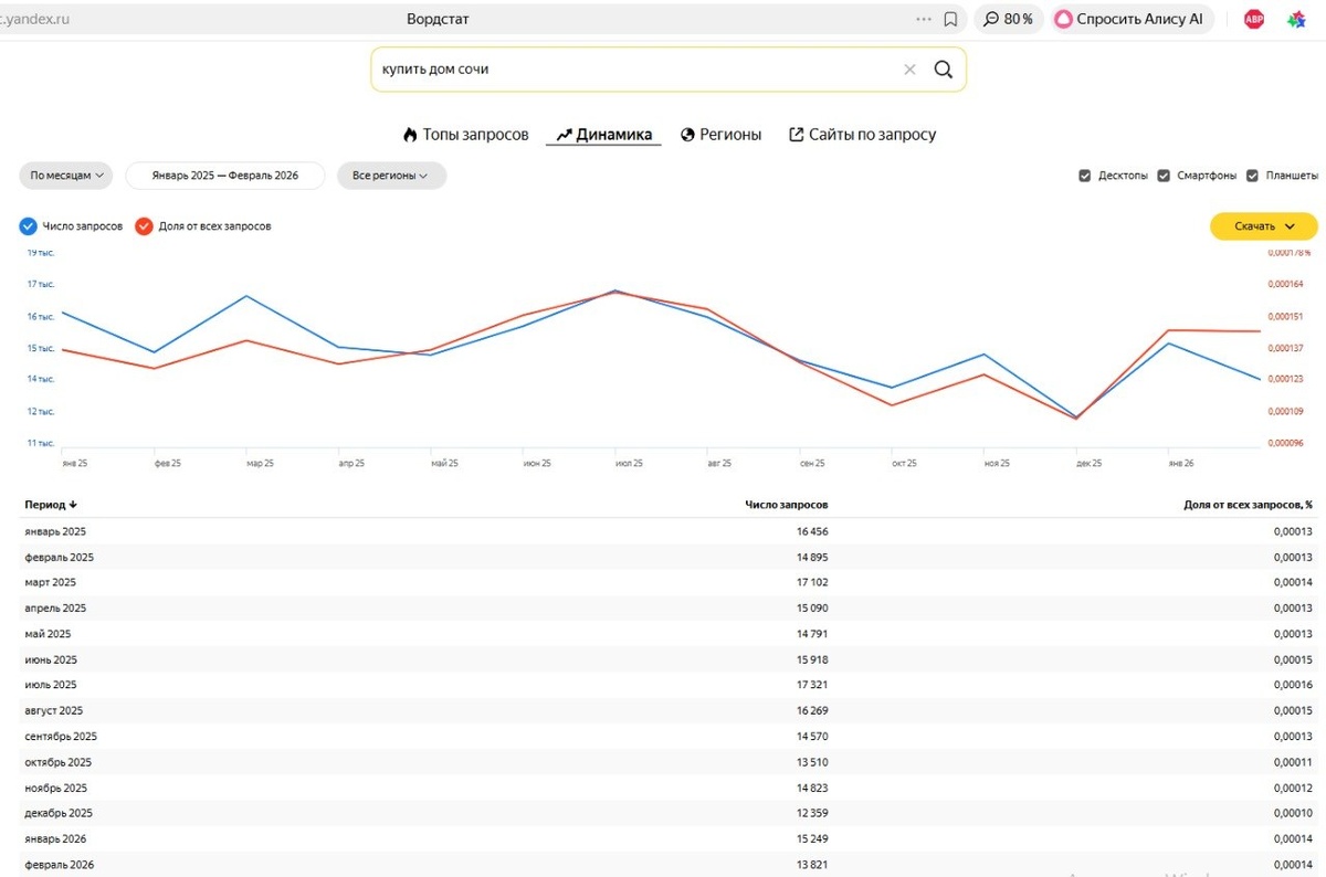 ⬆️ Зашла в Яндекс Вордстат, проверила динамику запросов по Сочи. Наблюдаем значительное снижение запросов за период с января 2025 по февраль 2026 ❤️"купить квартиру Сочи" - минус 29% с 48,3 тысяч запросов до 34,5 тысяч ❤️"купить дом Сочи" минус 16% ❤️"купить новостройку Сочи" минус 52% ❤️"Сочи ЖК" минус 13,8% Видим значительное проседание спроса на недвижимость. Продать стало сложнее. Покупатели выбирают тщательнее, не торопясь. Мой совет продавцам: не пренебрегайте подготовкой квартиры. Ваша квартира - одна такая. Найдите ее преимущества и определите кому она подойдет больше. Вот для них и пишите описание
