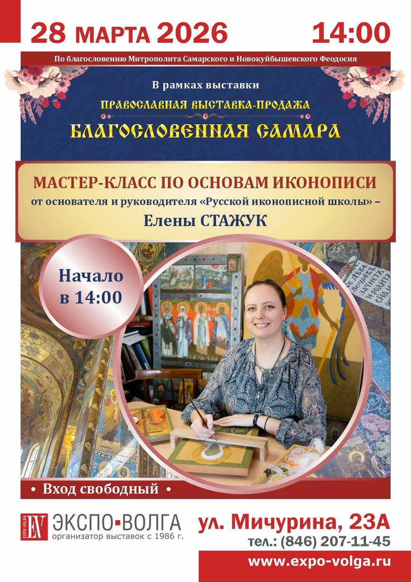 Дорогие друзья! Приглашаем вас на уникальный мастер-класс по основам иконописи от основателя и руководителя «Русской иконописной школы» Елены Стажук Это прекрасная возможность прикоснуться к древнему искусству, узнать секреты мастерства и попробовать написать икону своими руками под руководством опытного наставника Мероприятие проходит в рамках православной выставки-продажи «Благословенная Самара» по благословению Митрополита Самарского и Новокуйбышевского Феодосия ЧТО ВАС ЖДЕТ: КОМУ ПОДОЙДЕТ? Подробности по телефону: (846) 207-11-45 Сайт организатора: www.expo-volga.ru Приходите сами и зовите друзей! Будем вместе учиться писать иконы для души, для молитвы, для Бога.