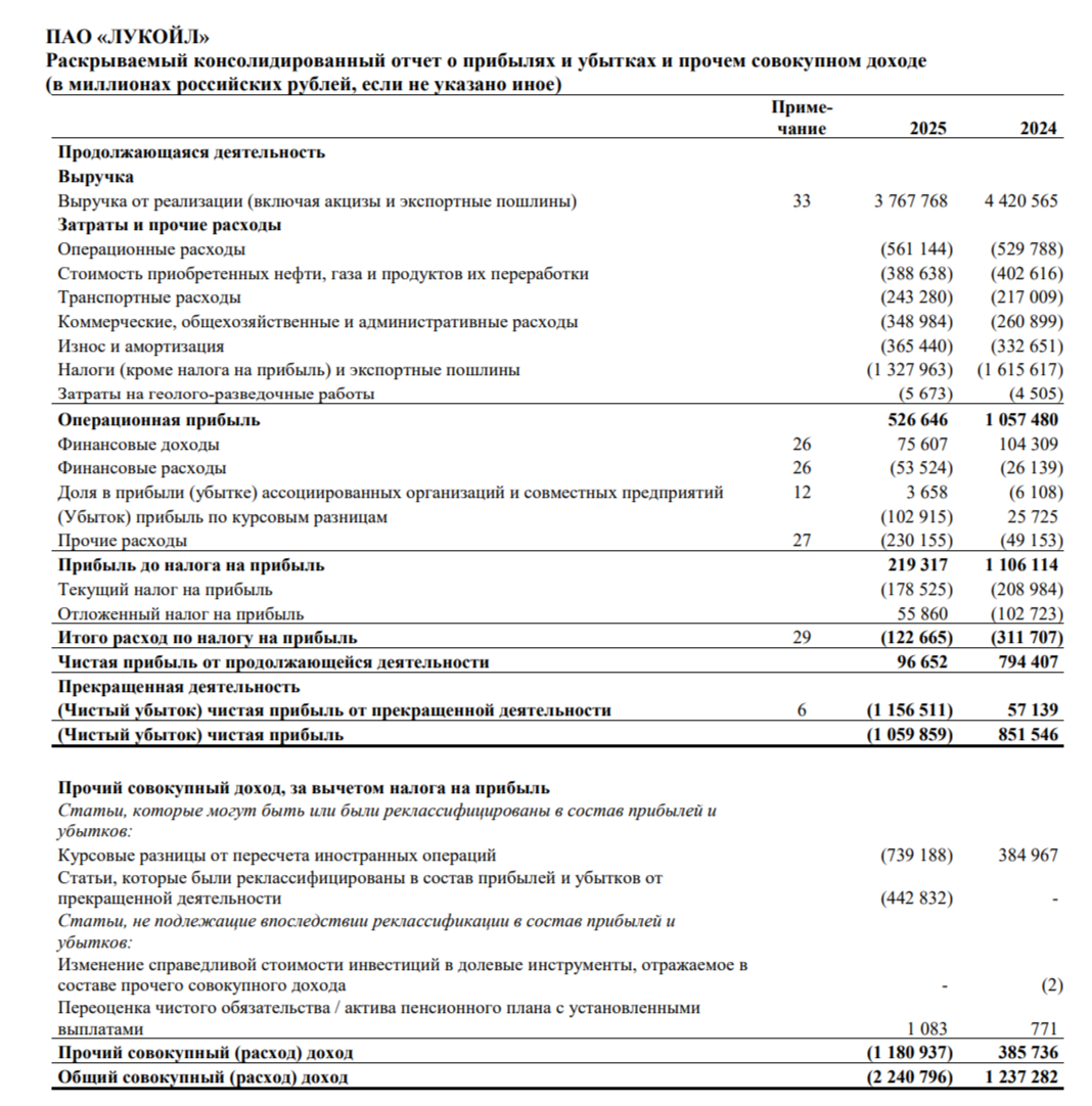 ⛽️ ЛУКОЙЛ опубликовал финансовые результаты по МСФО за 2025 год. Ожидаемо год для эмитента получился слабым (особенно II полугодие из-за попадания в SDN List), при этом логично, что компания списала свои зарубежные активы (LITASCO), конечно, при этом пересчитав данные за 2024 г. и I полугодие 2025 года: 🛢️ Выручка: 3,8₽ трлн (-14,8% г/г)