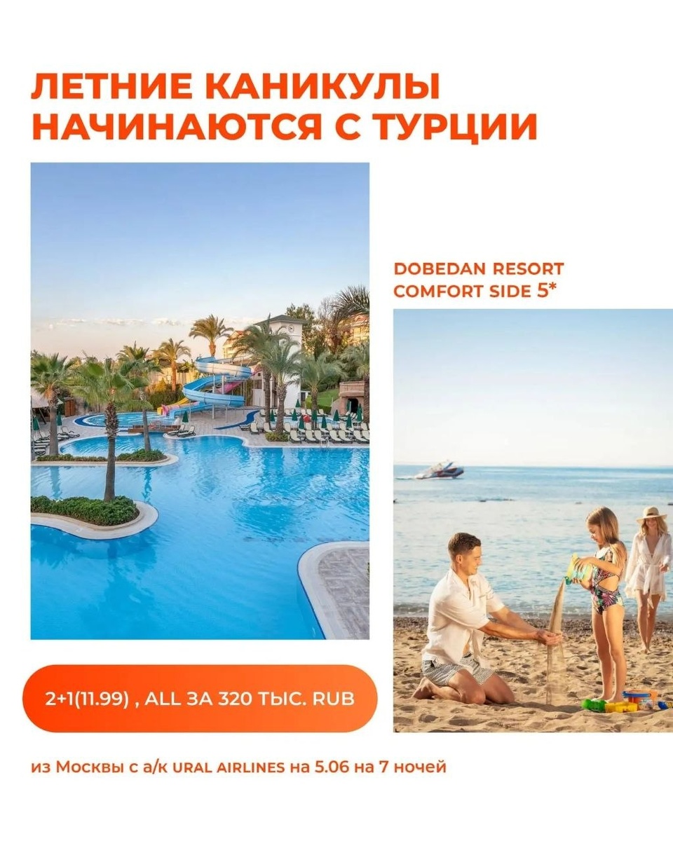 ! ✈️из Москвы с а/к Ural Airlines на 5.06 на 7 ночей 🌴Dobedan Resort Comfort Side 5* 2+1(11.99) , ALL за 320 тыс. RUB 🌴 Dobedan World Palace 5* 2+1(11.99) , ALL за 371 тыс. RUB 🌴 Nirvana Dolce Vita 5* 2+1(11.99) , ALL за 404 тыс. RUB * Стоимость указана на 2 взрослых и 1 ребенка до 12 лет