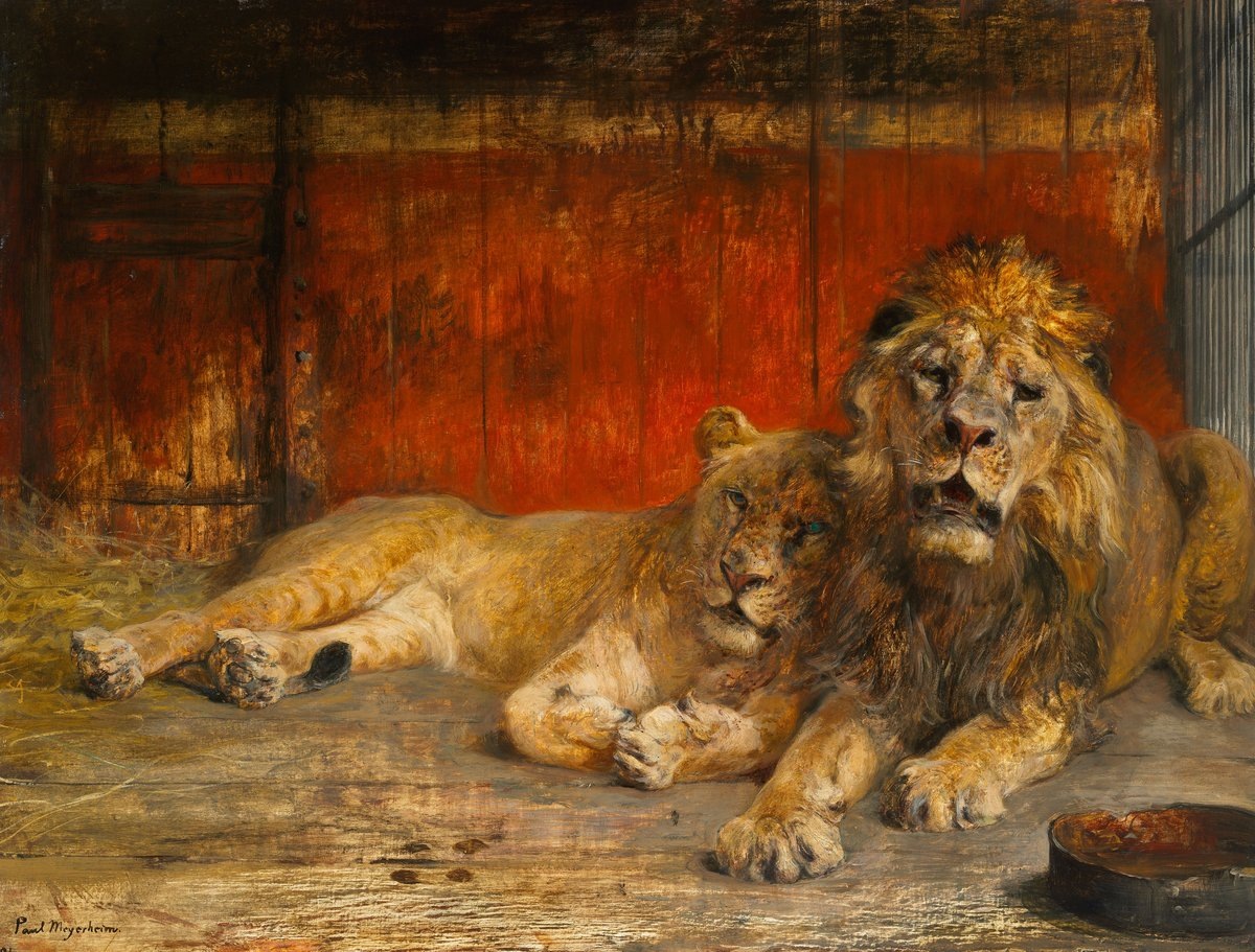 Пауль Фридрих Мейергейм (1842–1915), родившийся в известной немецкой семье художников, прославился как живописец, специализирующийся на изображении животных. Он был учеником и близким другом Адольфа Менцеля (1815–1905), важного представителя немецкого реализма и пленэрной живописи. Во время совместных прогулок Мейергейм учился у своего учителя тонкостям достоверного изображения природы. Мейергейм особенно интересовался изображением экзотических животных. Он любил проводить время в зоопарке и был очарован миром передвижных цирков. Картина «Львиная пара», вероятно, изображает цирковую клетку, в которой отдыхают величественный лев и львица. Картина представляет собой богато детализированное, реалистичное изображение животных в неволе, а красные деревянные панели создают драматический фон. Работа была приобретена в галерее Хайнеман в Мюнхене графом Денешем Андраши, последним владельцем замка Красна Горка. Граф был частым гостем в Мюнхене. Там он знакомился с художниками, которые час