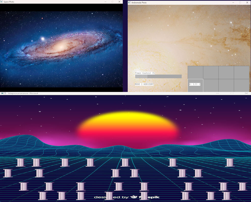 Подошло время для следующего шага. Уже под номером четыре. Шаг небольшой. Но больше для стабильности. Потому что прошло уже приличное время. И пора выпускать что либо. Пора выпускаться. Как говорится. И вот новый выпуск. Три заставки. Одна управляемая заставка. И две обычные заставки, где надо только смотреть анимацию. И никак повилять нельзя. В этот раз две темы. Это космос. Такая традиция. Потому что с космической темы я начал идею визуальных заставок. И одна это вэйпорвэйв тема. Ретро вэйв, синтвэйв. Такое цифровое будущее, 80ые тема. Первая заставка, для этой версии – это космические фото. Просто заставка. Смотришь на цикл из космических фотографий. Это 7 космических фотографий под музыку. Это первая заставка по этой версии. И тут есть фотографии Андромеда. И комета есть. Есть пульсар. Есть туманность. Довольно загадочные хотя и темные изображения космоса. Есть место ярким объектам в темноте. Космос – это нечто огромное и загадочное. Неудивительно что там есть место таким красивым