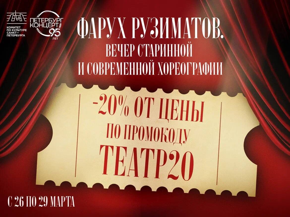 С 26 по 30 марта в «Петербург-концерте» действует праздничная акция - минус 20% по промокоду ТЕАТР20 на вечер старинной и современной хореографии в Екатерининском собрании. В центре программы - балет «Павана Мавра» с участием н. а. России Фаруха Рузиматова и примы Михайловского театра Ирины Перрен. Дополнят вечер концертные номера на музыку П. Чайковского, М. Равеля и Ж. Бреля в исполнении ведущих артистов балета. Успейте воспользоваться предложением и занять лучшие места в зрительном зале! 27.04 | 19:00 | Екатерининское собрание