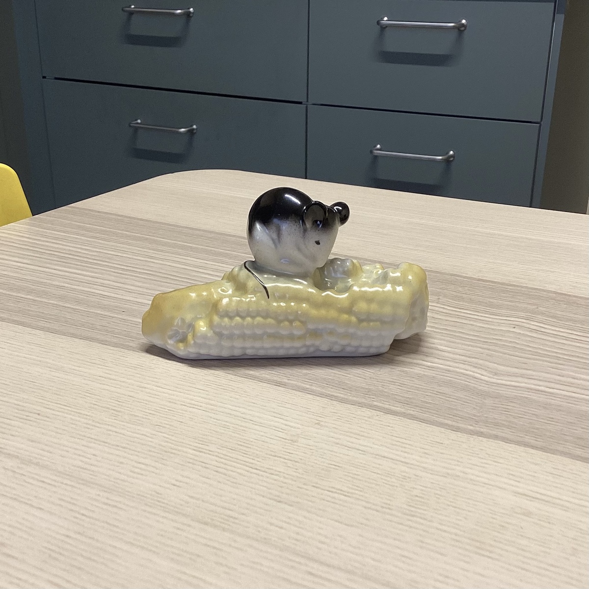 В начале осени на авито наткнулся на интересную фигурку "Мышь на початке кукурузы". Цена была средняя, но сразу взял её без раздумий, зацепила она меня. Бывает смотришь на вещь и в голове пробегает строка "Она должна быть моей срочно". Так и случилось с этой мышкой. Хотя казалось бы, роспись не то чтобы самая сложная, с помощью аэрографа, каких то деталей не так много. Цвета всего два, черный, да