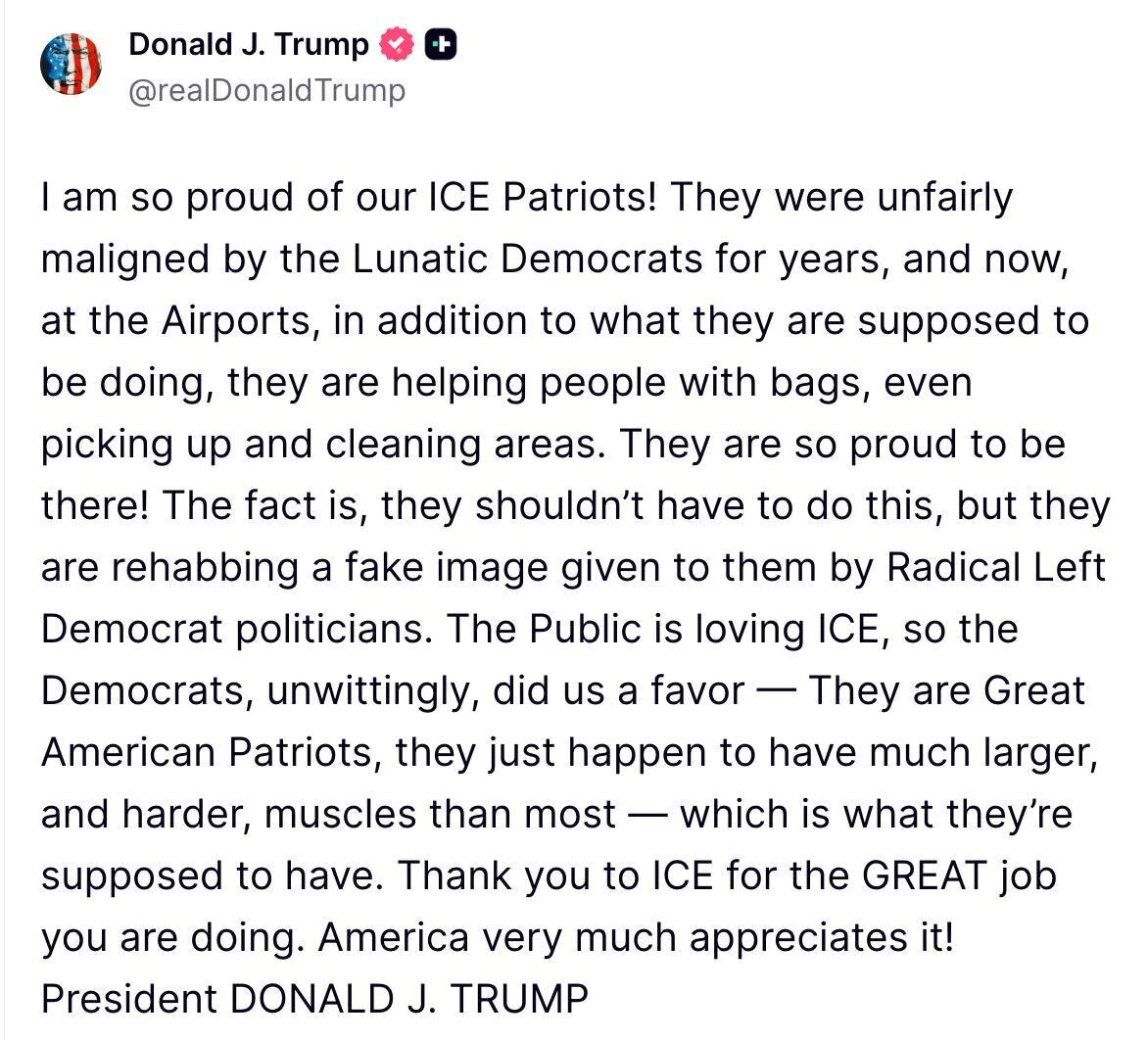 ‘The Public is LOVING ICE’ — Trump thanks ‘ICE PATRIOTS’ for helping out at airports amid DHS shutdown