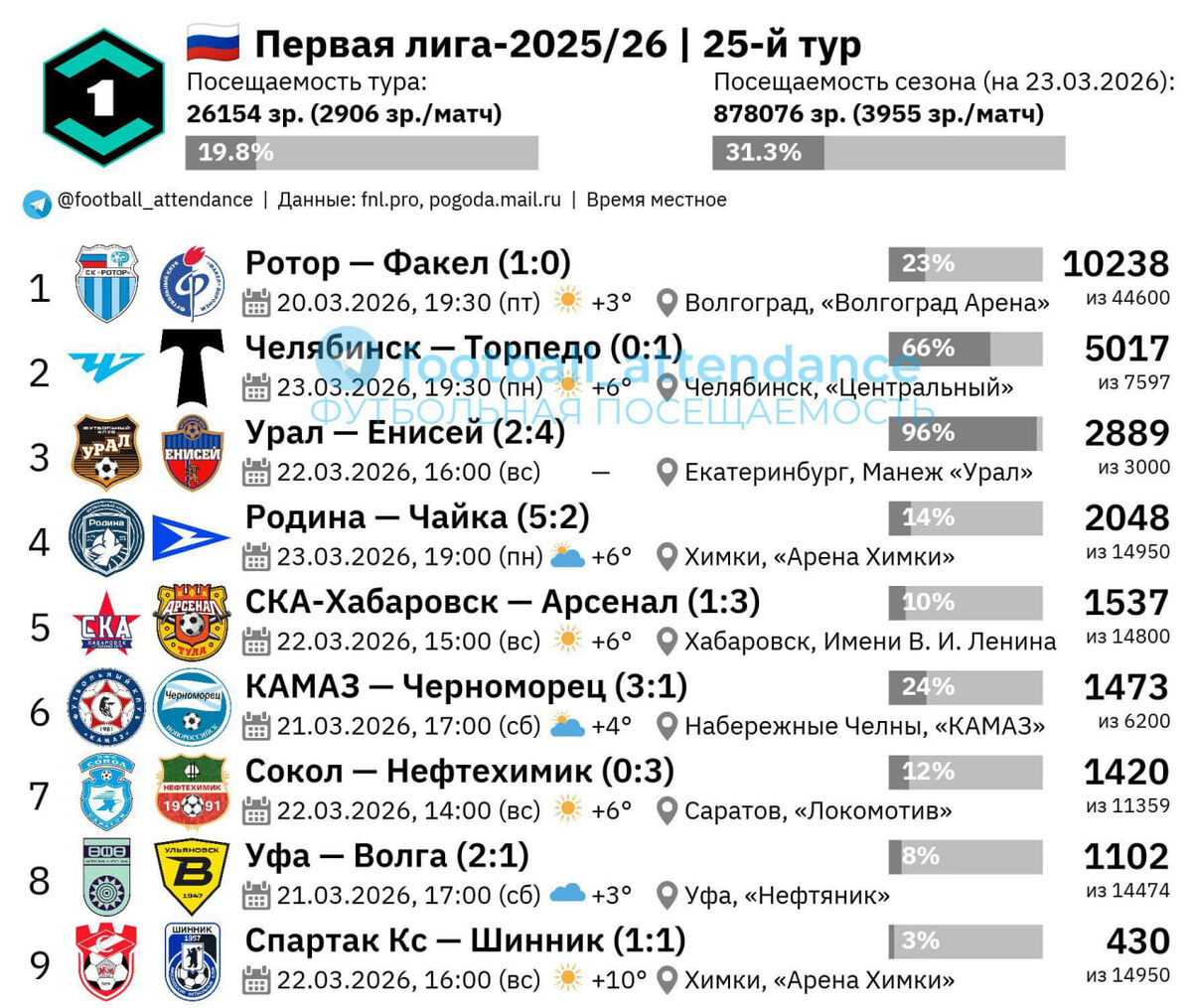 Средняя посещаемость 25-го тура Первой лиги-2025/26 составила 2906 зрителей