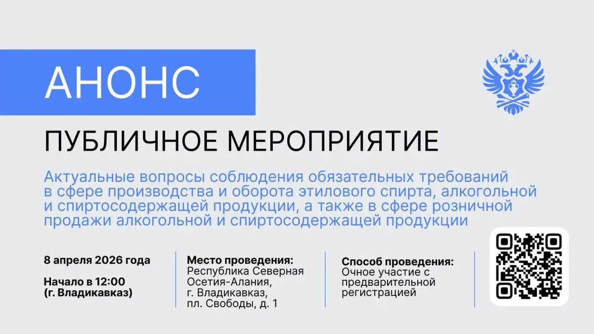 сообщает, что 8 апреля 2026 года в 12:00 (МСК) планирует проведение публичного мероприятия. Темы мероприятия «Актуальные вопросы соблюдения обязательных требований в сфере производства и оборота этилового спирта, алкогольной и спиртосодержащей продукции», «Актуальные вопросы соблюдения обязательных требований в области розничной продажи алкогольной и спиртосодержащей продукции». Публичное мероприятие состоится в формате очного участия с предварительной регистрацией. 📋 В рамках мероприятия будут рассмотрены следующие вопросы: 🔹 Контрольные мероприятия. Основные нарушения, выявленные в ходе проведения контрольных мероприятий 🔹 Обзор правоприменительной практики 🔹 Внедрение риск-ориентированного подхода 🔹 Цифровизация процессов проверок 📌 Подробнее о мероприятии и регистрации на сайте #Анонс #СКФО Росалкогольтабакконтроль МАХ | ВКонтакте | Telegram