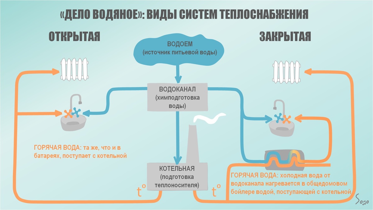 Горячая вода в водопроводе и батареях отопления: в чём разница? Часто возникает вопрос: горячая вода в кране и в батареях отопления — это одна и та же вода? Попадаются дома с собственной котельной — электрической или, в наших краях чаще, газовой. В этом случае вода одна и та же. Что касается обычного центрального отопления и водоснабжения: холодная вода в кухонный кран поступает с водопроводной станции, пройдя всю необходимую очистку; вода в батареях отопления первоначально эта же, тоже очищенная (но по другому), нагретая в котельной (понятное дело, явно не для питья). Горячая вода в кране зависит от схемы водозабора, которая может быть открытой или закрытой. В небольших населённых пунктах и в старых домах, скорее всего, будет система открытого типа. А это значит, что одна и та же горячая вода поступает в отопительные батареи и в кран. Это не очень хорошо, поскольку требования к горячей воде на бытовые нужды регулируются санитарными правилами, а требования к технической воде определяю