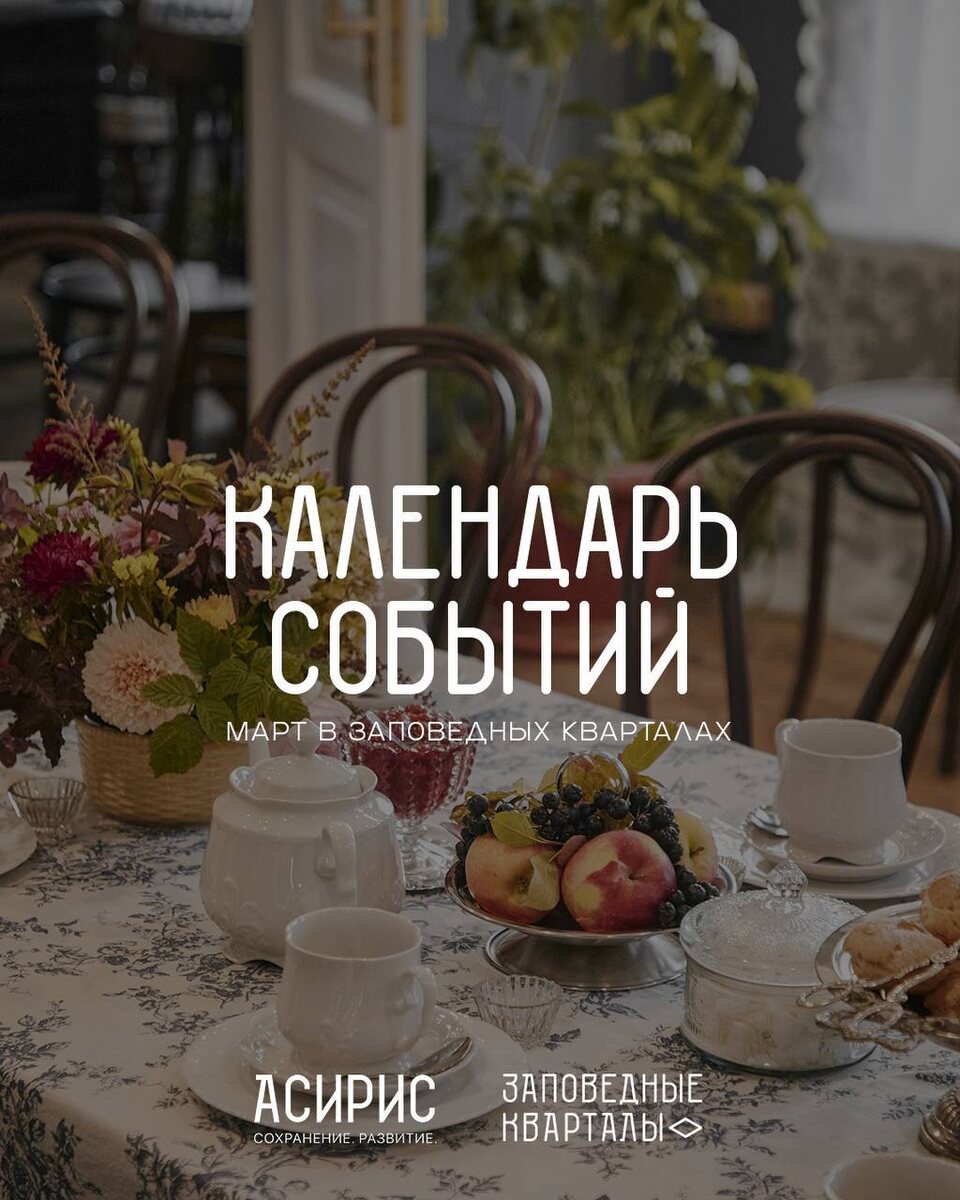 • Гастрономическая программа «Завтрак в усадьбе» 12+ Даты: 28, 29 марта в 10:00 📍 Короленко, 18 🎟 Подробности • Гастрономическая программа «Согревающие вкусы» 18+ Даты: 26 марта в 18:30, 28 марта в 16:30 📍Короленко, 18 🎟 Подробности • Гастрономическая программа «Секреты усадебной кухни» 12+ Даты: 27 марта в 18:30, 29 марта в 15:00 📍 Короленко, 18 🎟 Подробности • Экскурсия по доходному дому «В гостях у Щелухиной» 12+ Даты: 28 марта в 15:00, 29 марта в 12:00 📍 Короленко, 18 🎟 Подробности • Обзорная прогулка «Первый взгляд» 12+ Даты: 28 марта в 11:00 📍 Старт: Короленко, 18 🎟 Подробности • Иммерсивный квест с элементами аудиоспектакля «Свидетели квартала» 18+ Даты: 29 марта в 14:30 📍 Старт: Короленко, 18 🎟 Подробности • Детская интерактивная прогулка в наушниках «Детский взгляд» 6+ Дата: 29 марта в 10:30 📍 Старт: Короленко, 18 🎟 Подробности До встречи в Заповедных кварталах🫶🏻 💬 МАХ