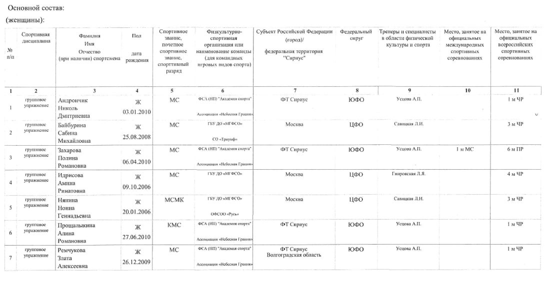Какие изменения? ЛИЧНИЦЫ ▪️Александра Борисова включена в основной состав, ранее не была в составе сборной ▪️Анастасия Власенко, Арина Ковшова, Ева Кононова включены в основной состав, были в резерве ▪️Виктория Беспалова перенесена в резервный состав, была в основном ▪️Лала Крамаренко, Милена Букина, Мария Дмитриева включены в резервный состав, ранее не числились в сборной ▪️Владислава Николаенко, Владислава Шаронова перенесены в резервный состав, были в основном ▪️Варвара Топорова исключена из состава сборной, ранее числилась в основном ▪️София Ланцова, Каролина Тарасова исключены из состава сборной, ранее числились в резервном ▪️Мария Борисова, София Ильтерякова, Ульяна Янус, Милена Щенятская, Екатерина Сазонова остались в основном составе сборной ▪️Карина Киреева, Арина Ткачук, Алиса Медведева, Николь Римарачин Диас остались в резервном составе сборной ГРУППЫ ▪️Николь Андрончик, Алина Прощалыкина, Полина Захарова, Нелли Реуцкая включена в основной состав сборной, ранее числились в