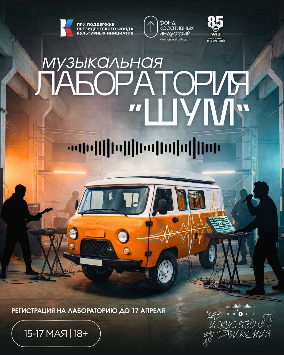 ») 🗓️ 15 мая – 17 мая 2026 В течение нескольких месяцев участники лаборатории будут работать над созданием песен, вдохновляясь эстетикой ульяновского автомобильного завода и его автомобилями. С 15.05 по 16.05 — образовательный этап лаборатории, на котором участники смогут послушать лекции от экспертов музыкальной индустрии 17.05 — шоукейс-фестиваль, на котором участники презентуют свои песни перед экспертным советом. Определение победителя, который получит право на запись трека, а также главный приз — 100.000 ₽ С 18.05 по 3.08 — запись, сведение, мастеринг и дистрибуция песни 7.08 — релиз песни на стриминговых платформах Подать заявку на участие можно до 17 апреля, подробности и ссылка на анкету тут Оценка заявок оргкомитетом пройдёт с 18.04 по 2.05, после будет отобрано 25 музыкальных групп (исполнителей)