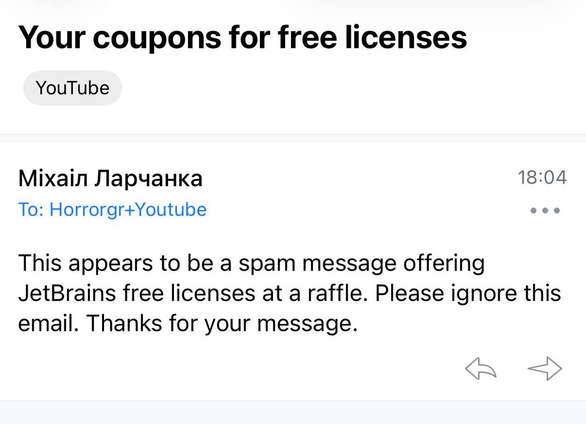 Мой бот отправил мне же письмо, что почта с ключами от Jetbrains - это спам и открывать его не надо. Как вообще он до него добрался? Я же просил только непрочитанные письма обработать 🤷🏻♂️