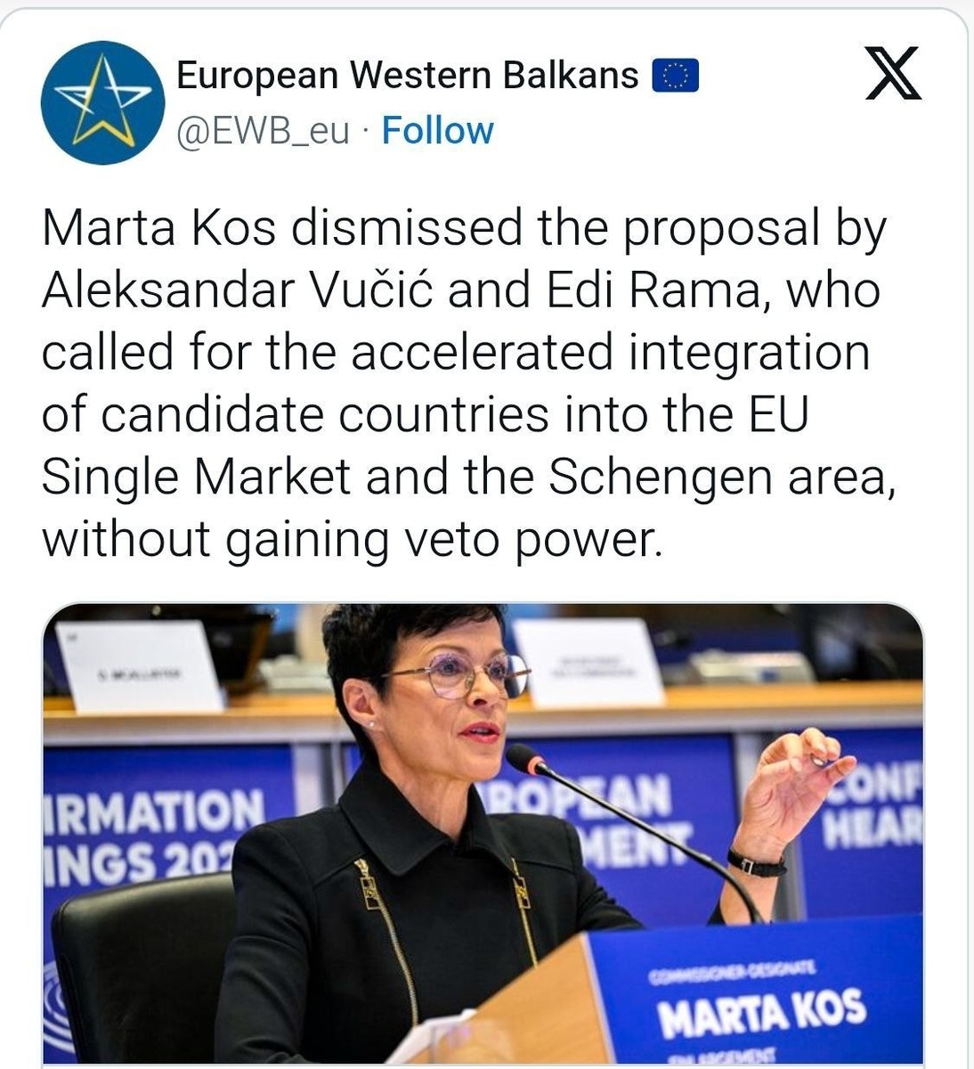 🇪🇺Marta Kos je odbacila predlog Aleksandra Vučića i Edija Rame, koji su pozvali na ubrzanu integraciju zemalja kandidata u jedinstveno