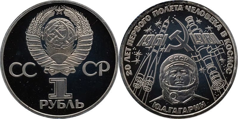 В 1981 году в Советском Союзе появилась первая массовая монета с изображением Гагарина — рубль к 20-летию полёта. Это была обычная по материалу монета, но совершенно необычная по смыслу.