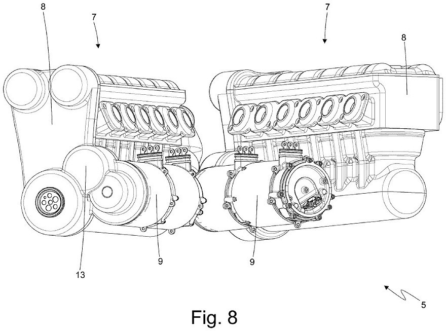 В электронной базе WIPO (Всемирная организация интеллектуальной собственности) всплыла любопытная конструкция гибридной силовой установки последовательного типа для серийных суперкаров Ferrari, в основе которой лежит невиданный прежде двигатель V12, состоящий из двух рядных «шестёрок» (каждая со своим коленвалом), объединённых общей системой смазки и общей системой выхлопа. Ferrari пока не собирается расставаться со своим классическим 6,5-литровым атмосферным V12 F140, которым оснащает топовые переднемоторные модели, но думает о будущем и о том, как приспособить 12-цилиндровый двигатель к суперкарам с гибридной силовой установкой последовательного типа. Пока что у Ferrari есть только параллельные гибриды, в том числе флагманский суперкар Ferrari F80, их силовые установки довольно громоздкие, хотя бы уже потому, что в паре с ДВС должна работать коробка передач. Последовательным гибридам коробка передач не нужна, ДВС здесь не имеет механической связи с колёсами, работает в режиме генерат