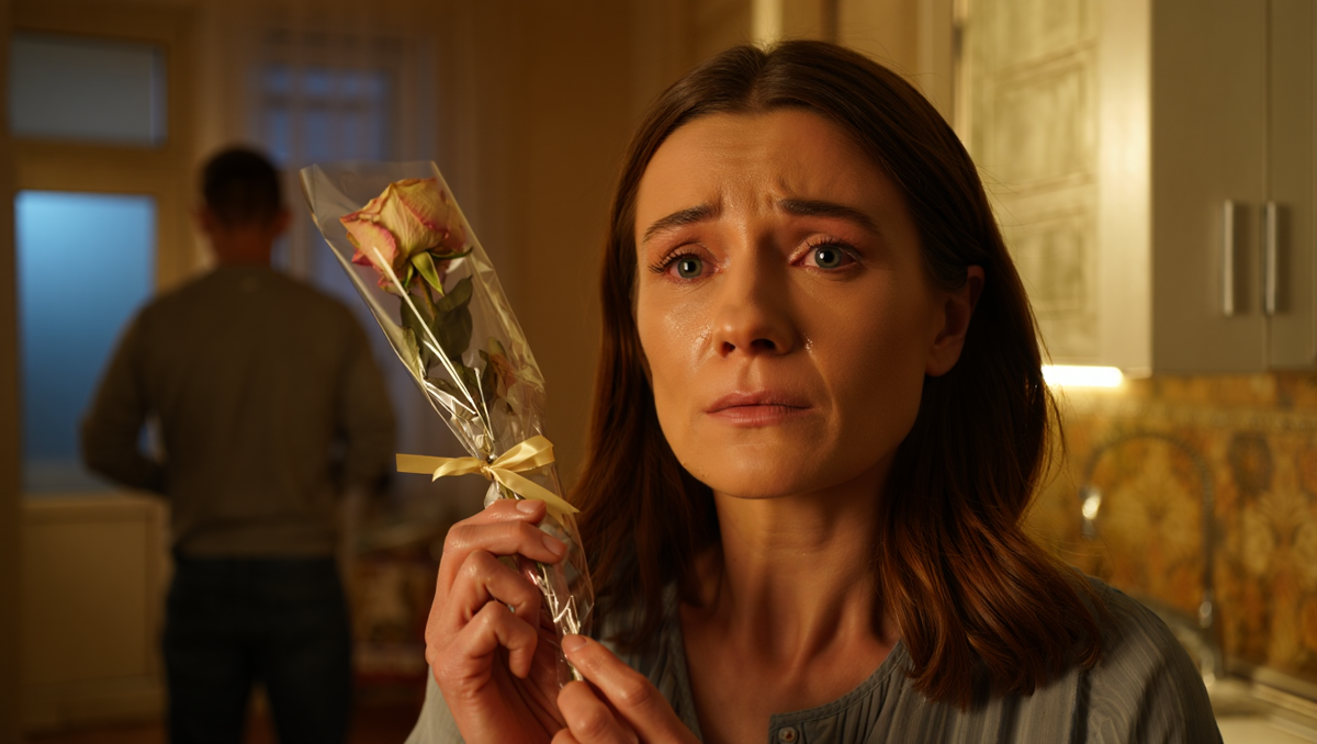 Роза была дешёвая. Та самая, из ведра у кассы супермаркета — полузавядшая, в мятом целлофане с золотой надписью «С любовью».