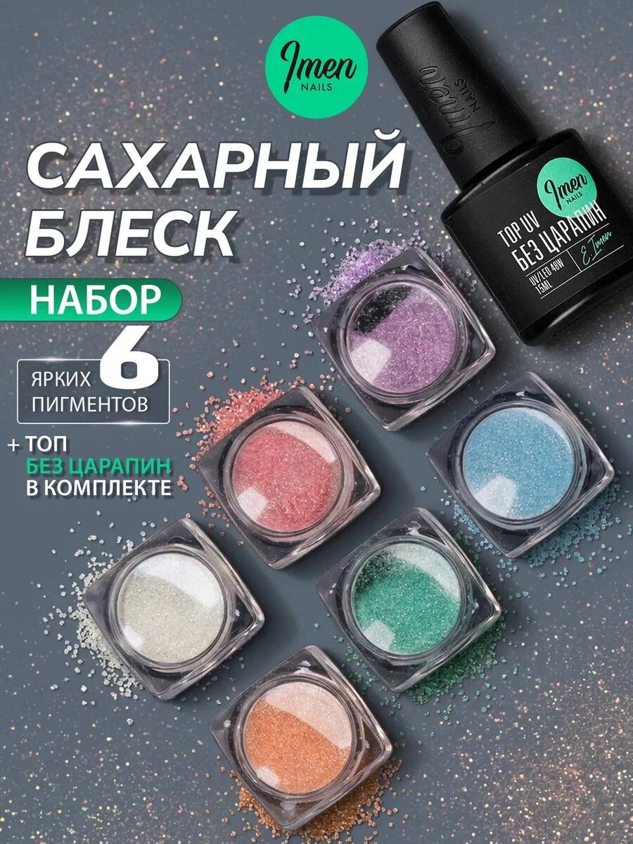 ❣️Набор для создания эффектного сияющего покрытия с текстурой «сахарного» блеска. В комплект входит топ без царапин и 6 оттенков мелкодисперсных блёсток, которые создают плотное искристое покрытие с мягким переливом.