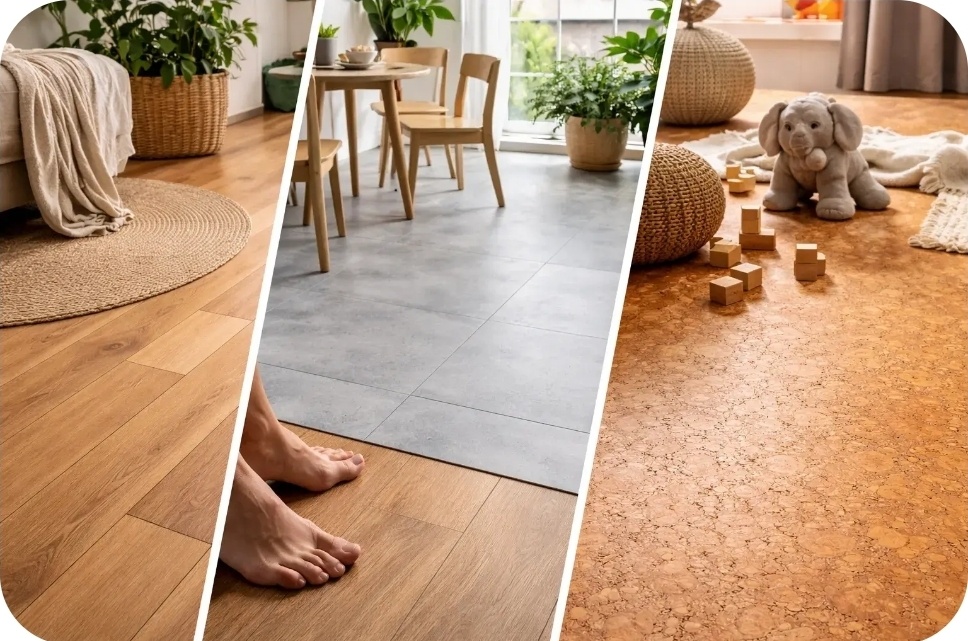 Это идеальное решение для спален и детских комнат. Пробка обладает амортизирующими свойствами, снижает шум шагов и дарит ощущение мягкости. Для тех, кто привык ходить по дому босиком, это покрытие станет настоящей находкой.