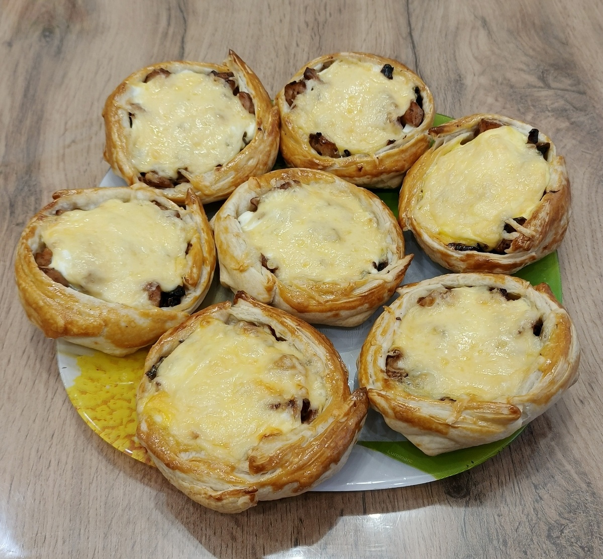 - Закладываем начинку в корзиночки и смазываем тесто желтком