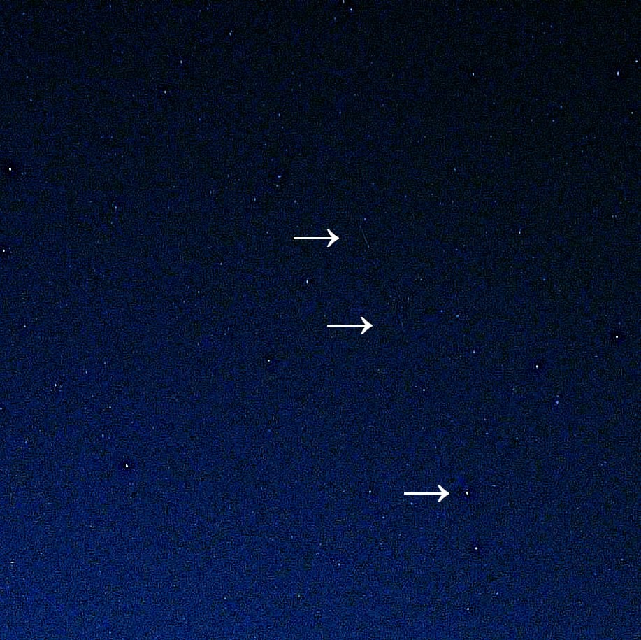 Астрокамера смогла зафиксировать треки от движения запущенных ранее спутников. Пролетели с юга на север примерно в 2110 по местному времени. Самый яркий первый спутник. Остальные слабые.
