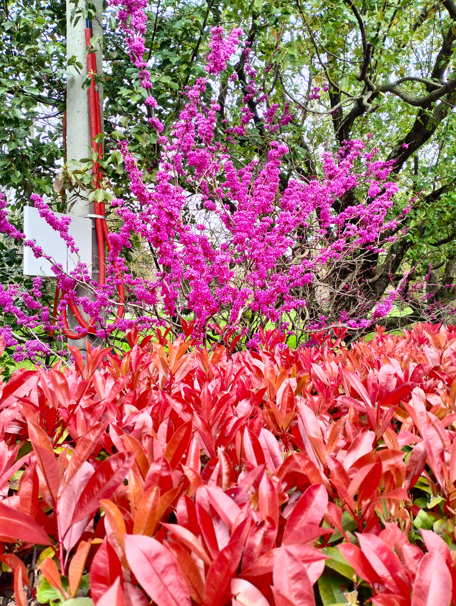 Церцис (он же Багрянник, или «Иудино дерево») — главный сюрприз дня. Он только начинает зацветать, и на его ветвях, которые пока еще стоят почти без листьев, уже проклюнулись сотни маленьких сиреневых бутонов. Это выглядит фантастически — будто кто-то рассыпал конфетти по веткам. Еще немного, и он превратится в сплошное розово-сиреневое облако.