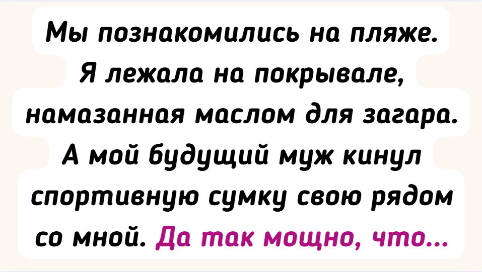 - Мы познакомились на пляже. Я лежала на покрывале, намазанная маслом для загара. А мой будущий муж кинул спортивную сумку свою рядом со мной. Да так мощно, что на меня сыпануло песком. Я в песке в итоге, а он купаться ушел. Вернулся, я с наездом на него. Познакомились. Думаю еще, кто-то ведь женой твоей станет. А женой стала я. © azalia_jem4ugova