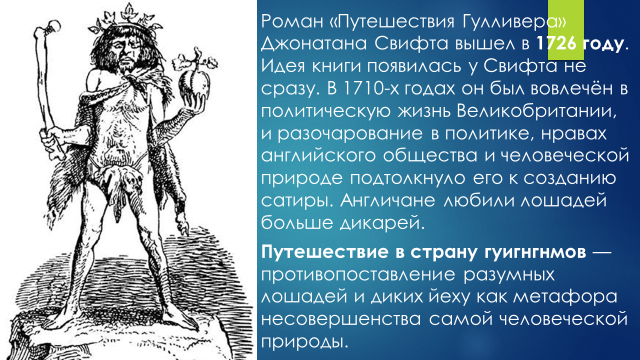 u Роман «Путешествия Гулливера» Джонатана Свифта вышел в 1726 году. Идея книги появилась у Свифта не сразу. В 1710-х годах он был активно вовлечён в политическую жизнь Великобритании, но вскоре разочаровался в политике. Раздумья о нравах английского общества и о человеческой природе подтолкнули его к созданию сатирических произведений, которые ныне знает весь мир. Англичане времен Свифта любили лошадей больше дикарей. Так уж получилось. Колониальное мышление превалировало в среде английской аристократии, и не только.