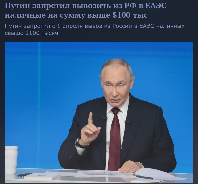 🔥 Путин пытается остановить бегство среднего класса из России: Президент РФ экстренно ввёл запрет на вывоз из РФ в ЕАЭС наличных на сумму