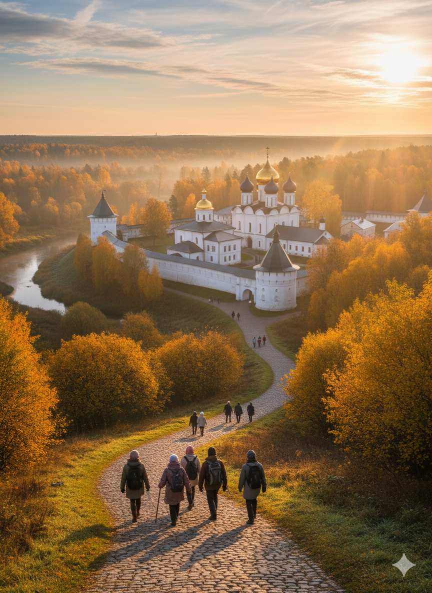 Неспешная прогулка вдоль внешних стен Оптиной пустыни — это отдельный и незаслуженно недооценённый опыт. Монастырь выстроен почти квадратным в плане, и обход его снаружи открывает виды, которые не увидеть изнутри: золотые купола над соснами, белые башни на фоне синего неба и великолепную панораму с берега Жиздры.