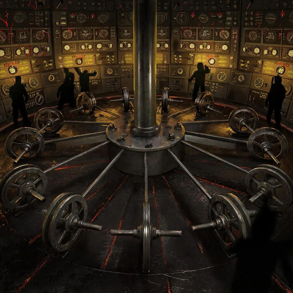 Это было круглое помещение, стены которого были увешаны гигантскими циферблатами, стрелки которых дрожали в красной зоне. В центре зала, уходя в пол и потолок, располагался главный пульт управления — огромный столб, от которого, как спицы от колеса, расходились массивные стальные маховики ручного управления поглощающими стержнями.