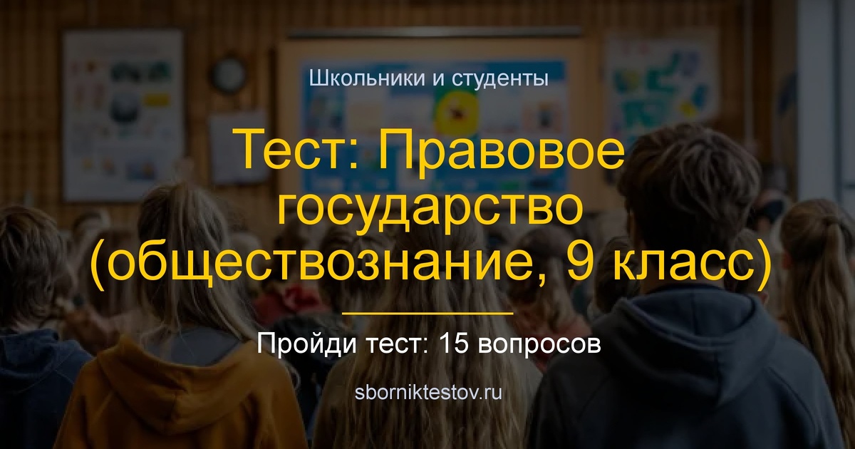 ) Проверь свои знания о фундаментальных принципах правового государства! Тест для учеников 9 класса охватывает разделение властей, верховенство закона, независимость суда, гарантии прав граждан и признаки гражданского общества. Покажи, насколько хорошо ты усвоил отличия правового государства от неп... 15 вопросов · Тест на знания Уже прошли: 927 человек ▶️ Пройти в Телеграм ▶️ Пройти в MAX 🌐 Пройти на сайте СборникТестов