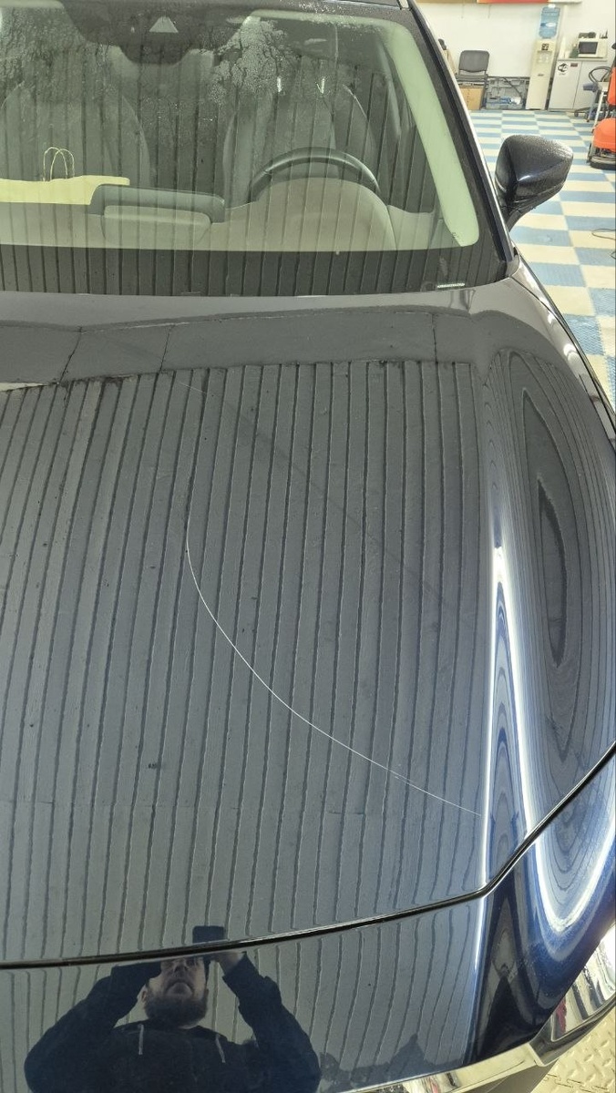 Серьёзная, глубокая царапина, оставленная "хорошим" человеком. В данном случае реставрацию царапины мы не предлагали, как как это Мазда с толщиной лкп 59-70мкм, вероятность пробития лкп при шлифовке материала после наращивания очень велика! Тогда автомобиль точно поехал бы в перекрас. Решено ограничиться полировкой на сколько это было возможно.