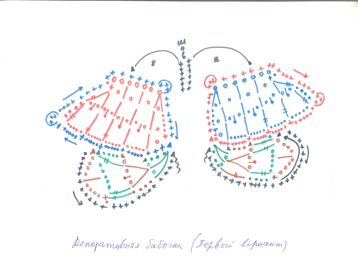 Первый вариант. На цепочке из семи воздушных петель сделайте три ажурных сетчатых ряда. Затем обвяжите эти ряды столбиками без накида по периметру, начиная над последним сетчатым рядом. Довяжите по схеме маленькое крылышко. Вторую сторону начните так же с трёх сетчатых рядов, но обвязывайте столбиками без накида, как продолжение сетчатого ряда. Потом довяжите маленькое крылышко. Отделочной нитью свяжите усики и туловище. С изнанки сшейте две половинки бабочки по туловищу.