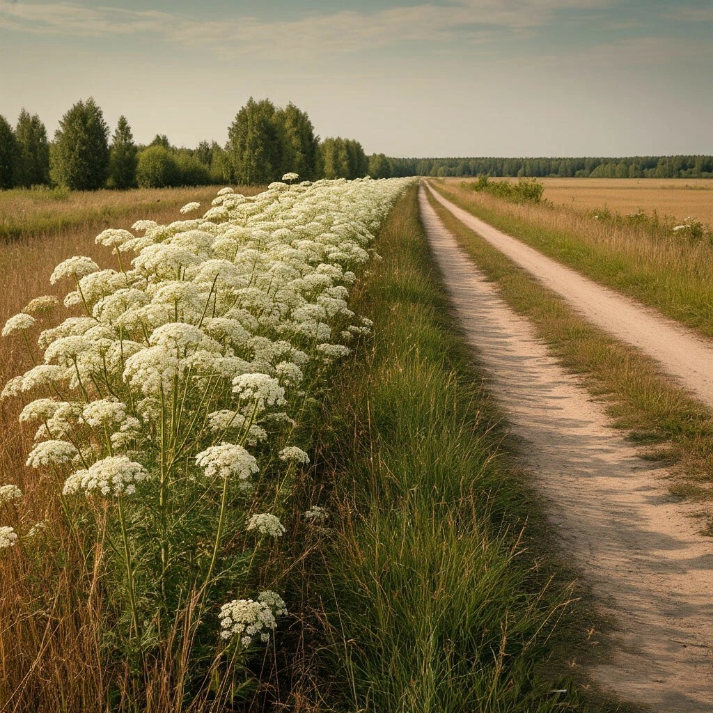 Мы вышли на открытое место — бывший луг, который теперь превратился в одно сплошное море борщевика. Растения стояли так часто, что между ними невозможно было пройти. Верхушки зонтиков смыкались над головой, образуя бело-зелёный шатёр. Внутри этой живой стены было душно и тихо. Ни птичьего гомона, ни стрекота кузнечиков — только тяжёлое гудение шмелей, которые, как заворожённые, кружили над цветами.