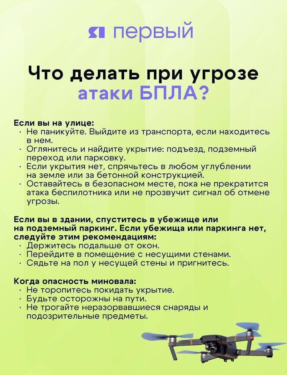 Соблюдайте спокойствие и действуйте следующим образом⤵️ 🔴Если вы находитесь на улице, покиньте открытые участки и укройтесь в ближайших зданиях. 🔴В помещениях зашторьте окна плотными занавесками или опустите жалюзи. 🔴Отойдите от окон на безопасное расстояние и старайтесь находиться в комнатах со сплошными стенами. На территории региона могут находиться фрагменты беспилотников, важные для следствия. Если вы их обнаружите, ни в коем случае не прикасайтесь к ним и не используйте телефоны рядом. Отойдите на безопасное расстояние и незамедлительно сообщите о местонахождении фрагментов по телефону 112. Берегите себя и оставайтесь в безопасности ❤️ 💚 Мы в МАХ